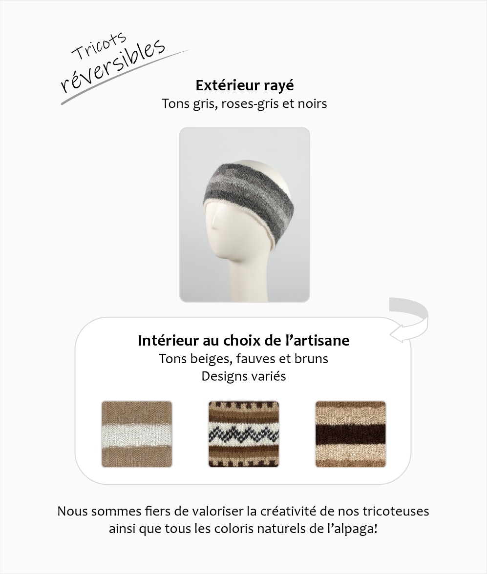 • Double-layered and reversible knit: inner knit style and colors chosen by the artisan