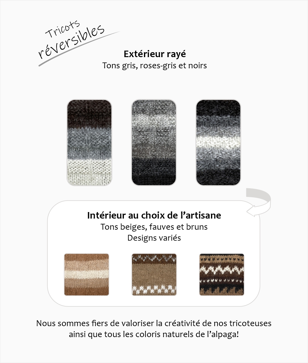 La nature fait si bien les choses en nous offrant 22 tonalités naturelles d’alpaga. Nos tricoteuses sont fières de valoriser ces riches coloris naturels sans aucune teinture.